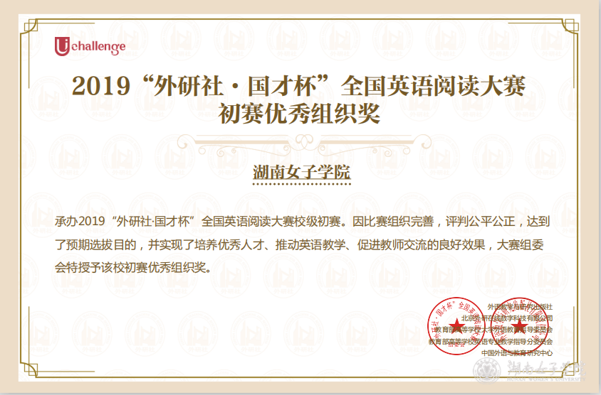 至此,从2015至2019年近五年,在教务处和文学院领导的关怀下,由文学院杨阳老师领队参加的“外研社·国才杯”全国英语阅读大赛,每年派出三位指导老师指导三位学生参加湖南赛区复赛,共30人次获奖。五年来,老师们获得全省指导一等奖4次、二等奖5次、三等奖6次;学生获得全省一等奖4次、二等奖5次、三等奖6次。2018年、2019年由于我校组赛得力,赛事举办规范而有序,我校两次获得全国英语阅读大赛“初赛优秀组织奖”,杨阳老师两次获得“优秀初赛管理员奖”。