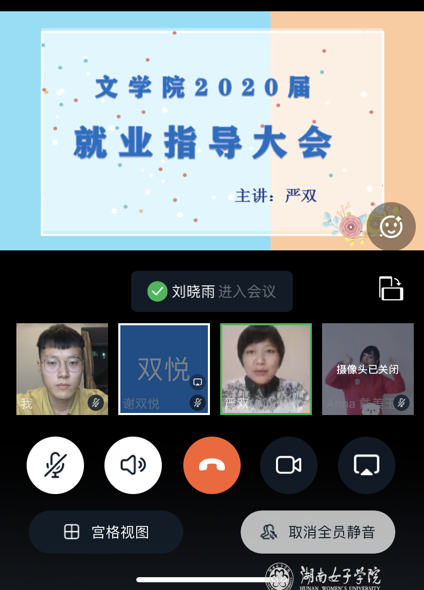本网讯(文学院 严双 谢双悦)为了帮助毕业生更好地了解当前新的就业形势,更深入地了解同学们求职过程中遇到的各种问题与挑战,更精准地做好就业指导与帮扶, 5月15日下午,文学院再次召开2020届毕业生就业指导年级大会。学院党委副书记严双为毕业生带来了一场以“快马扬鞭谋当下,积极进取赢未来”为主题的线上就业指导会。