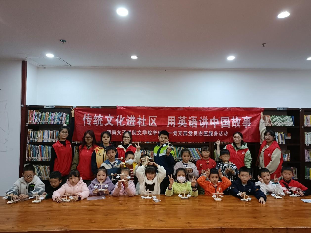本网讯(文学院 李滢 邹子鑫)为传承优秀传统文化,发挥党建引领作用,增强党员志愿服务意识,近日,湖南女子学院文学与传播学院学生第一党支部“壹加壹”志愿服务队深入社区,持续开展“用英语讲好中国故事”系列主题志愿服务活动。据悉,文传院学生第一党支部“壹加壹”志愿服务队秉持着“奉献、友爱、互助、进步”的志愿精神,自2023年初以来,该支部联合长沙市图书馆雨花非遗分馆、长郡天心实验学校X1912班开展大学生党员志愿服务达15次,中小学生受众人数约320余人。