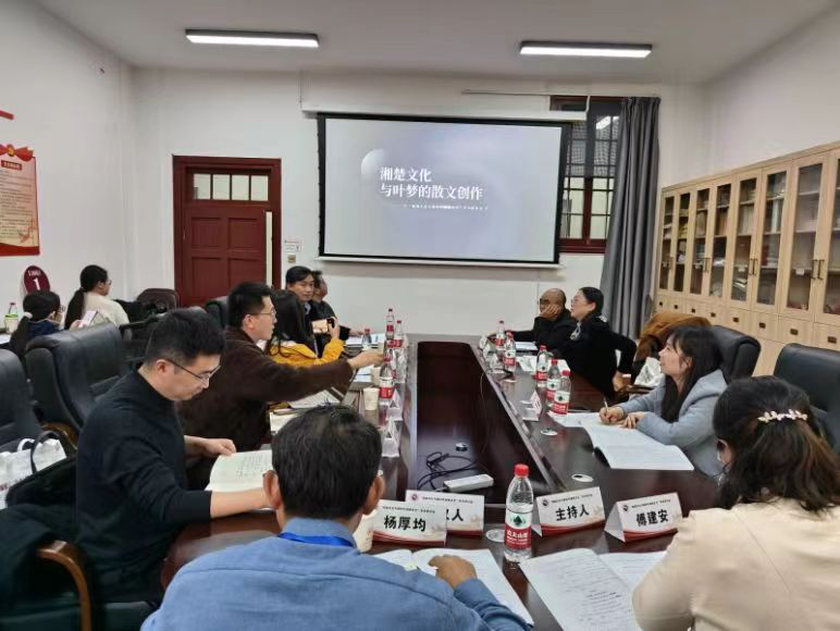 与会专家学者围绕“湖湘文化的特质”、“湖湘文化传统与新时代文艺批评”、“新时代湖南文学的群体创作现象”、“湖南青年文学创作”等议题展开深入探讨。我院参会教师认真聆听了专家和同行的报告,积极参与研讨交流。青年教师杨杰蛟在分论坛上作了题为《湘楚文化与叶梦的散文创作》的主题发言,提出湘楚文化求新求变的特质、巫性思维、经世致用的精神对湖南作家叶梦的散文创作具有直接的启示性作用。