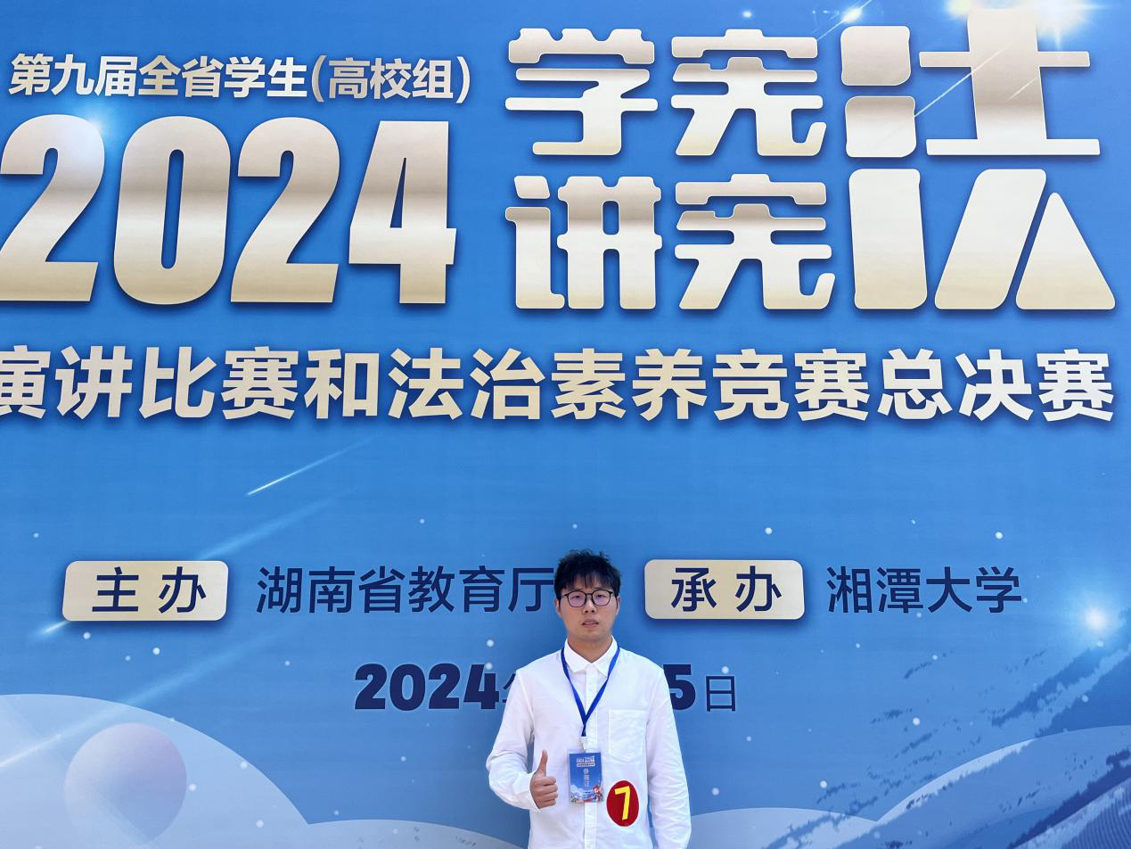 本次活动由湖南省教育厅主办、湘潭大学承办,有来自省内多所高校的12名选手参加总决赛。备赛阶段,匡茂林同学虽不是法学专业学生,但是展现出顽强的竞赛毅力,将我院学子敢作敢为、善作善成的优秀品质带到全新的竞赛领域,实现了我院在法治素养类比赛中的历史性突破,突显出我院在人才培养上的全面发展理念。