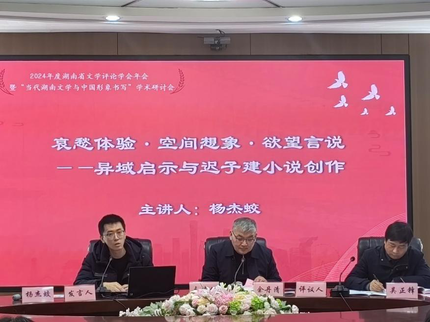 学术研讨会上,湖南省社会科学院文学研究所所长卓今,湖南大学罗宗宇教授,中南大学易彬、晏杰雄教授,湖南师范大学岳凯华教授,湖南理工学院杨厚均教授,衡阳师范学院任美衡教授、湖南财政经济学院林铁教授等三十余名学者围绕“当代湖南文学与中国形象书写”这一议题展开卓有成效的讨论。我院教师杨杰蛟以《哀愁体验·空间想象·欲望言说——异域启示与迟子建小说创作》为题,剖析俄、日、法三国文学对迟子建小说创作所具有的滋养作用。