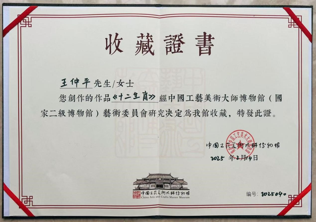 (通讯员 谢鹏)当传统棕编与现代艺术碰撞出璀璨火花,一只只灵动的棕编生肖正跨越时空讲述中国故事。近日,湖南女子学院文学与传播学院王仲平教授收到中国工艺美术大师博物馆颁发的收藏证书,其匠心之作《十二生肖》棕编系列被永久馆藏。这是继其作品斩获江西省第三届文创设计大赛二等奖后,再次以“非遗+创意”的力量叩响国家级艺术殿堂之门。