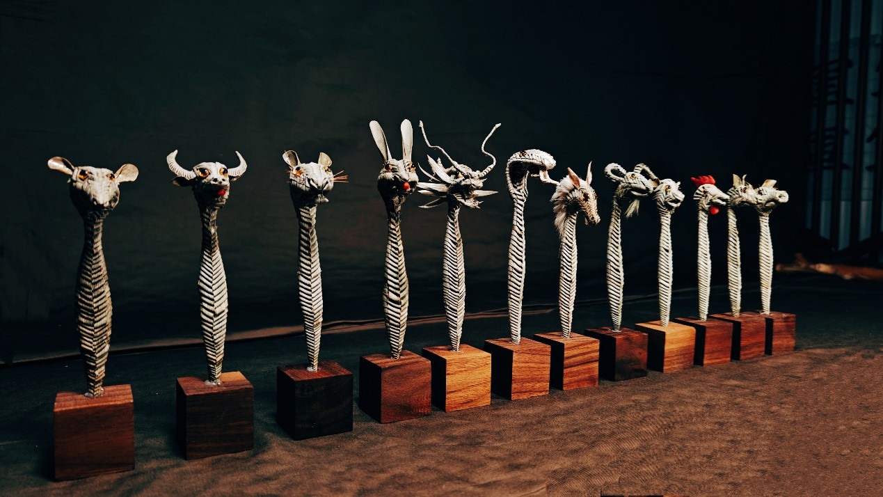 在中国工艺美术大师博物馆——这座云集全国顶尖工艺美术作品的殿堂里,王仲平的《十二生肖》以独特姿态惊艳亮相。作品巧妙运用双编法、多编法、剪贴法等多种技法,将十二生肖幻化为憨态可掬的现代艺术符号:龙须生动传神,骏马鬓鬃飞扬……这种 “老手艺+新表达”的创作理念,正是作品脱颖而出的关键。“每根棕叶都在说话”,看到十二生肖的师生都不禁赞叹,“这是让非遗‘活’在当下的生动实践”。