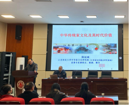 本网讯 (文学与传播学院 谭玮 肖云)2026年1月12日上午,江苏师范大学中华家文化研究院院长陈延斌教授做